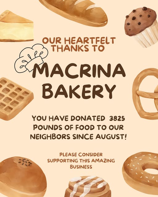 We have 3,825 reasons to be thankful for @macrinabakery . That’s the total pounds of food they’ve generously donated to us since August. Their incredible support has provided premier quality pastries, breads, cookies, and other treats to over 3,000 people in under three months.