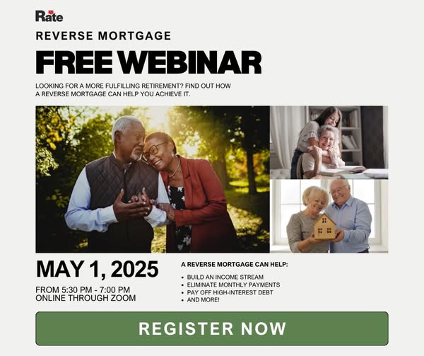 Join our friends at Rate on Thursday, May 1st, 2025 for a FREE Reverse Mortgage Informational Webinar Register now: https://bit. ly/Reverse_Mortgage_Webinar Learn how a reverse mortgage can help: - Build an income stream - Eliminate Monthly Payments - Pay off high-interest debt - And more.