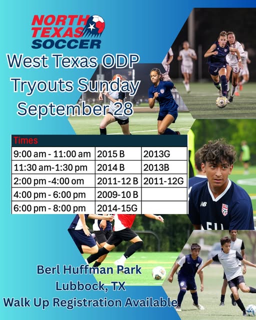 π¨ West Texas ODP Tryouts β This Sunday. π¨ Join us September 28 at Berl Huffman Park, Lubbock, TX for Olympic Development Program tryouts. β½ β Walk-up registration available (arrive 30 minutes early) π Tryout t-shirt included π΅ Cost: $135 π¨βπ« Coaching staff includes top coaches from UTPB, HSU, ACU, WTA&M, LCU, Ranger Junior College, and other highly qualified coaches.