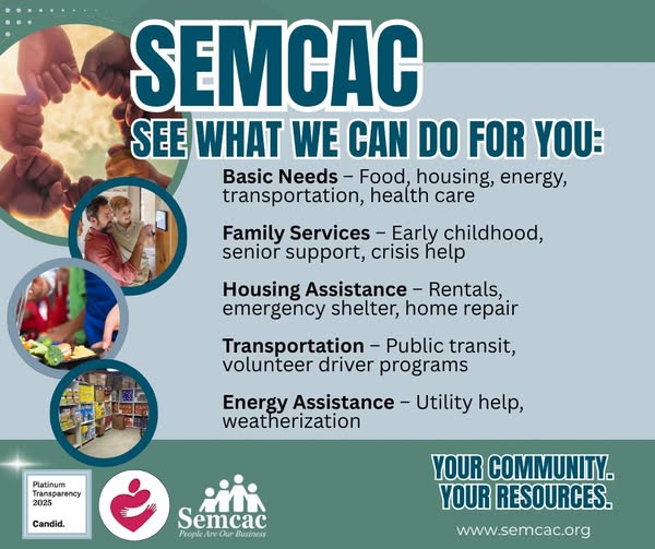 π Thank you for letting us serve you. π At Semcac, weβre proud to support our communities through: π Basic Needs β Food, housing, health care, energy, transportation π¨βπ©βπ§ Family Services β Early childhood, senior support, crisis help π‘ Housing Assistance β Rentals, emergency shelter, home repair π Transportation β Public transit, volunteer drivers β‘ Energy Assistance β Utility help, weatherization π€ Community Services β Resources & advocacy Together, weβre building stability and hope across the communities we serve. πͺ #ThankYou #Semcac #CommunityAction #StrongerTogether.