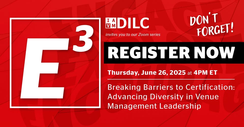 LAST CHANCE to register for TODAYโS Eยณ webinar, โBreaking Barriers to Certification: Advancing Diversity in Venue Management Leadership,โ where weโll discuss how CVP and CVE designations can create pathways to leadership for underrepresented individuals in the venue management industry. ๐ TODAY at 4PM ET ๐ Register NOW: https://buff. ly/f9WVj75 #IAVM #E3 #diversity #events #leadership.