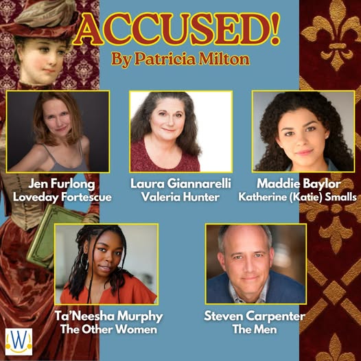 Announcing the cast of ACCUSED. , by Patricia Milton ππ This marks the final play in the "Victorian Ladies' Detective Collective" series. The tenacious Detective Collective, sisters Loveday and Valeria, with American actress Katie, take on a new murder case to sleuth.