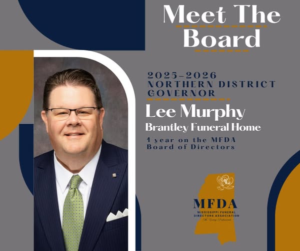 Meet the Board: Lee Murphy Lee Murphy is a Northern District Governor for MFDA and serves as Market Director for Service Corporation International (SCI), overseeing operations across Arkansas and the Memphis Metro area. He is a licensed funeral director and embalmer in both Mississippi and Tennessee and works with Brantley Funeral Home. Originally from the Arkansas Delta, Lee moved to Mississippi in 1998 to attend mortuary school and has been serving families ever since.