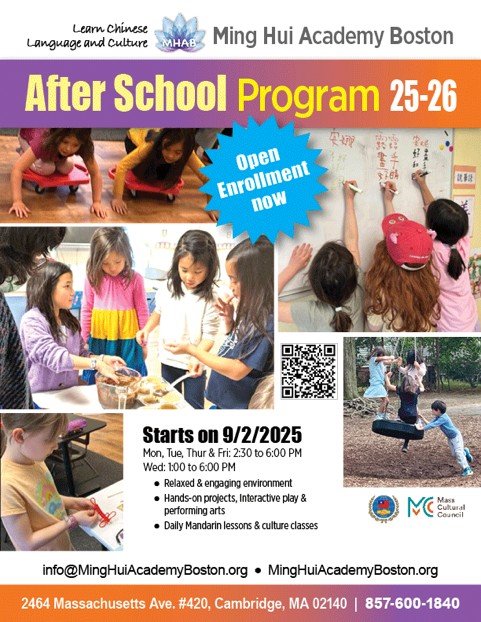 Looking for an enriching after-school program. 🎓 At Ming Hui Academy Boston, children (ages 5–11) learn Mandarin in a fun, hands-on environment—through games, songs, stories, crafts, and cultural activities. ✅ Small class sizes ✅ Daily Mandarin lessons ✅ Licensed by MA EEC 📍 Conveniently located in Cambridge 📅 Limited spots available—register now.