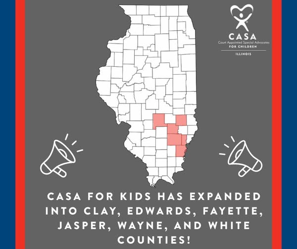 🎉 CASA for Kids is growing. We are excited to share that our local program has expanded into Clay, Edwards, Fayette, Jasper, Wayne, and White counties. This expansion means more children across Illinois will have the advocacy and support they deserve.