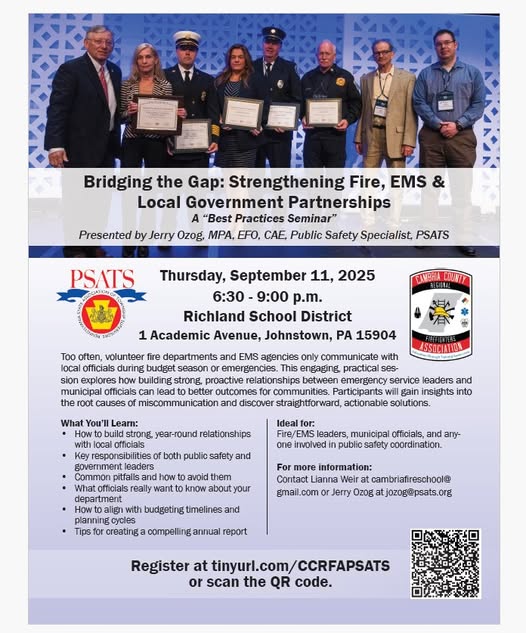 Cambria County Regional Firefighters Association | Saint Michael, PA Education Through Training Saves Lives Our Mission The objective of this association shall be the general improvement of the firefighting service throughout the county and vicinity to afford protection to disabled firefighters and to those dependent upon them through legislative enactment to open discussion upon the best manner and means for the fighting of fires and their prevention to promote the organization of fire departments in towns and villages now without such protection to encourage a fraternal friendship among firefighters and to promote education and training of firefighters. CCRFA 2025 Fire Academy The71st Annual CCRFA Fire Academy Weekendsare almost here. Please find attached important details regarding start times and locations. Key Information Training Locations Cambria Heights High School 426 Glendale Lake Rd Patton PA 16668 CCRFA Fire Training Academy 292 Ott Road Patton PA 16668 Patton Fire Company 1 Station 62 410 Magee Ave Patton PA 16668 Sunday ClassesYour instructor will inform you of the location for Sunday sessions.