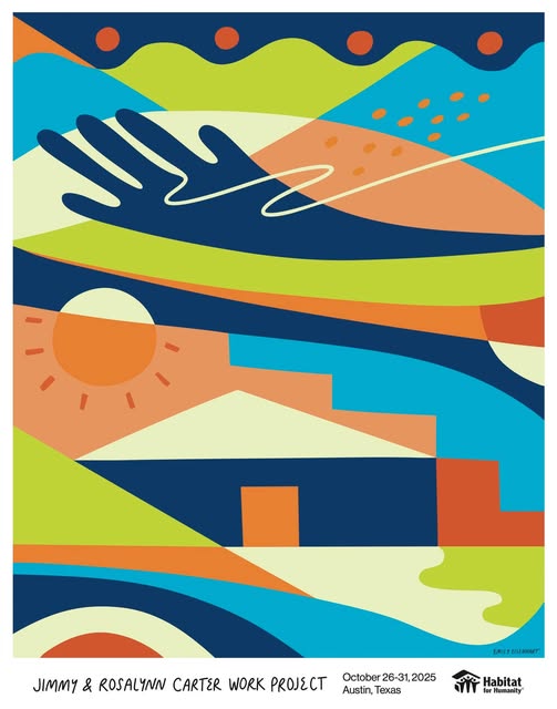 Support affordable homeownership in Central Texas and own a piece of art that captures its spirit. We are thrilled to have partnered with Austin artist Emily Eisenhart on this limited-edition commemorative poster for the 2025 Jimmy & Rosalynn Carter Work Project, a beautiful representation of the strength of our mission. In Emilyโs words, โThis artwork celebrates movement, color, and connection โ the energy that rises when people unite to build something greater than themselves.