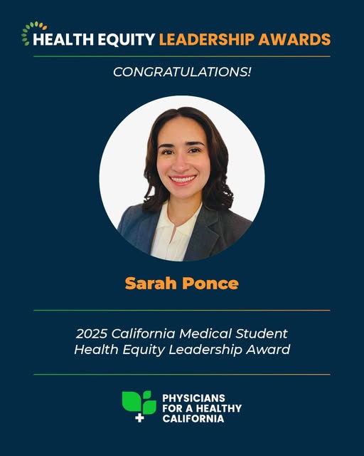 Congratulations to our Health Equity Leadership Awardees. Sarah Ponce is the recipient of our Medical Student Health Equity Leadership Award for her efforts working toward becoming a leader in promoting health equity within California. She is an is an M.