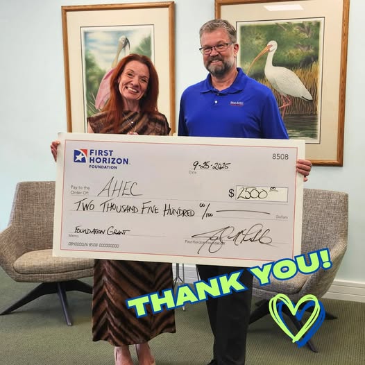 THANK YOU. Jacqueline Luhta presented Michael Cunningham with a generous grant from First Horizon Bank for Keys AHEC this week. Grants like this help us to continue providing vital medical and dental care to local children so they can thrive in school and throughout their lives.