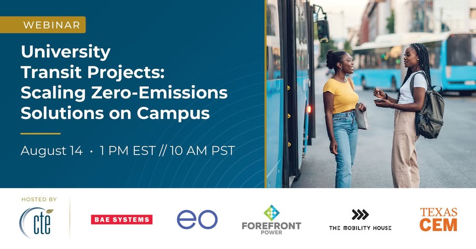 Missed our webinar "University Transit Projects: Scaling Zero-Emission Solutions on Campus". Catch up on the conversation about how universities are implementing zero-emission transit solutions to support sustainability goals and reduce their carbon footprint. Watch now ➡️ https://cte.