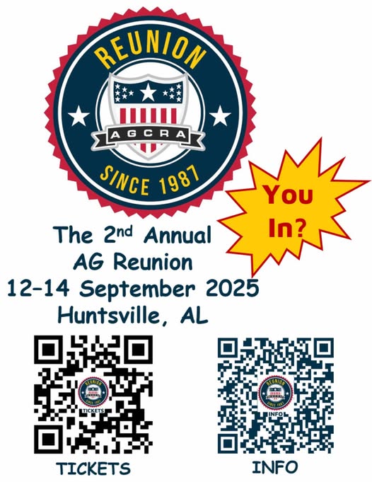 🎉 One Week to Go. 🎉 The 2nd Annual AGCRA Reunion kicks off 12–14 September in Huntsville, AL—don’t be the one hearing about it after the fact. This is your chance to reconnect, celebrate, and make new memories with the AG Family.