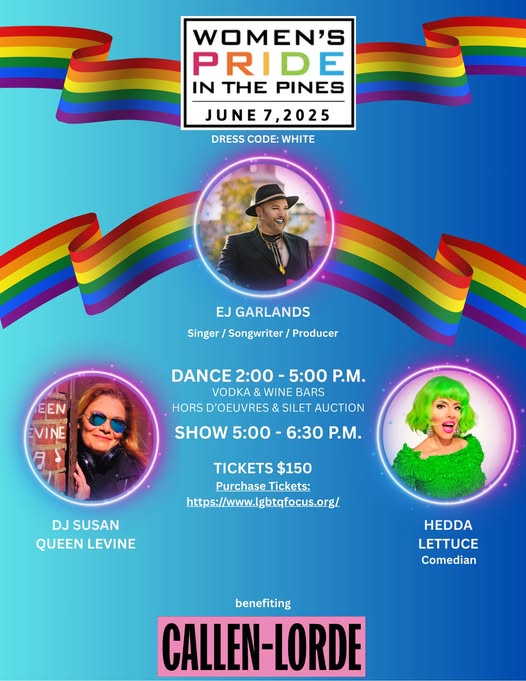 Join us on June 7, 2025 Pines Pride supported by "Women's Pride in the Pines " and the LGBTQ Focus Foundation. Tickets http://lgbtqfocus.org