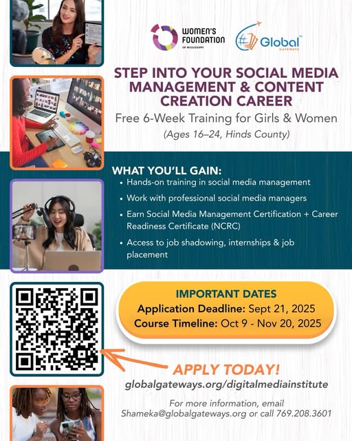 17 weeks ago we announced receiving funding from Women's Foundation of Mississippi to launch our Digital Media Art’s Training Institute. Today we are excited to introduce our first course—Social Media Management & Content Creation. This 6-week, hands-on course is designed to equip young women (ages 16–24) with the skills, tools, and opportunities that provide career pathways in the rapidly growing field of social media management.