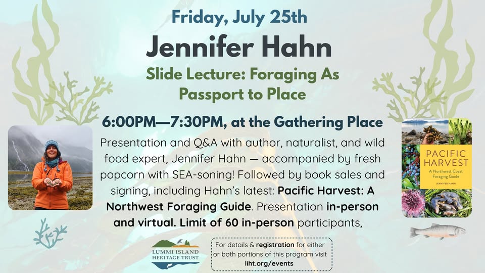 This Friday, July 25th at 6PM at the Gathering Place and streaming on Zoom: "Foraging As A Passport to Place" with Jennifer Hahn. Foraging for wild food, eating between tide and forest, makes life a delicious journey. It is a passport to place for northwest naturalist and author Jennifer Hahn, teacher of a popular science course called “Wild Food” at Western Washington University’s Fairhaven College.
