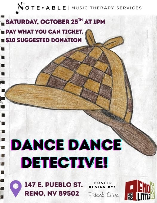 This Saturday at Reno Little Theater. Dance Dance Detective An original musical composed and written by Musical Connections from Note-ables Music Therapy Services. 1:00 pm Pay-What-You-Wish In the year 1989, a group of friends (Amber, James, Ryan, And Heather) arrive at a Halloween party held at a cabin in the woods.