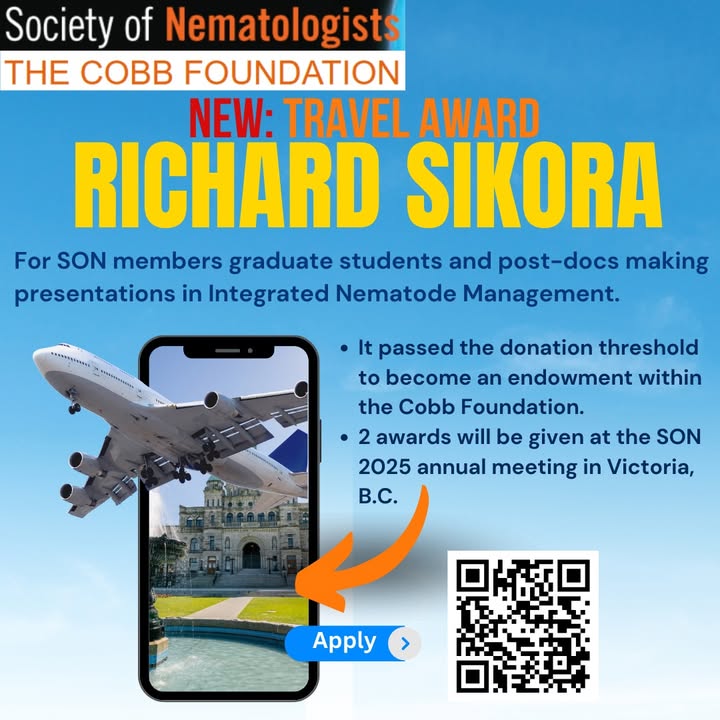 We are excited to announce that the application window for the new Richard Sikora Travel Award is now open. This travel award is for SON members grad students and/or postdocs presenting about Integrated Nematode Management. Scan the QR code for details or follow this link: https://www.