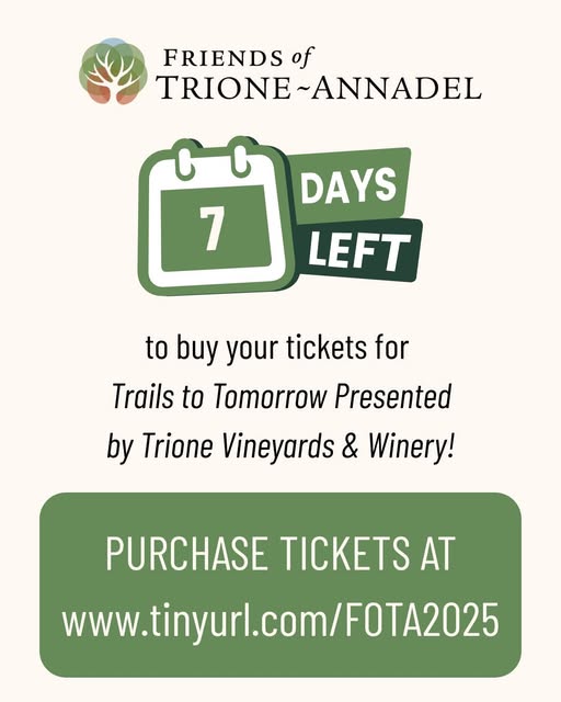 The countdown continues. Just ONE WEEK left to buy your tickets to Trails to Tomorrow: A Benefit for Friends of Trione-Annadel presented by Trione Vineyards and Winery. Join us for an evening of fun on September 27th while supporting FOTA's work in Trione Annadel State Park.