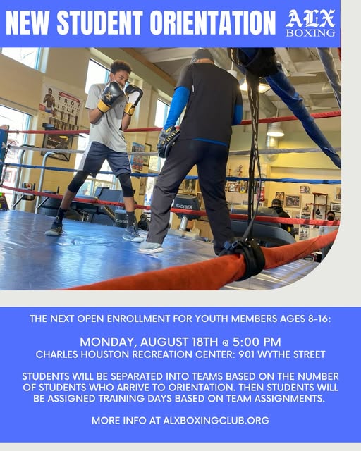 ALX Boxing Club Building champions in the ring and in life since 1980 The mission of ALX Boxing Club is to create a safe space for youth to build a champion mindset by learning life skills through the sport of boxing. NEXT NEW YOUTH MEMBER ORIENTATION Please check back regularly on our website for the next open orientation. Charles Houston Recreation Center 901 Wythe Street Accepting students Ages 816 Students should attend orientation in clothing ready to do a light workout It takes a team to nurture challenge and grow champions. We offer community youth Development Programs and Boxing Classes.
