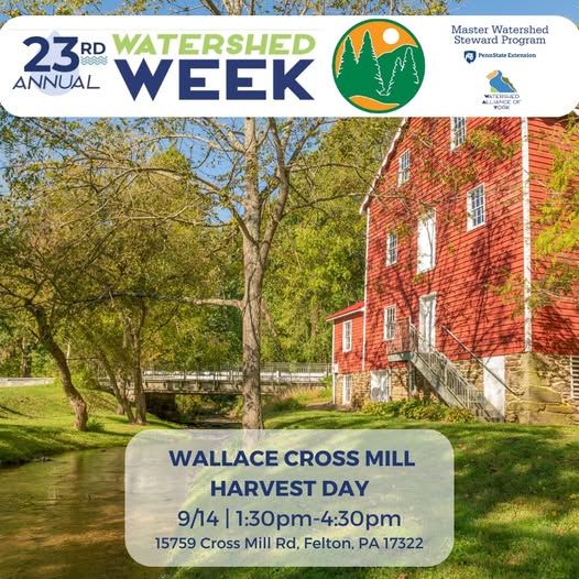 This year during Watershed Week, take a visit to Wallace Cross Mill on September 14th between 1:30pm and 4:30pm for a special Harvest Day Open House. Celebrate the harvest by working with grains ground at Wallace Cross Mill. In addition to seeing the mill in operation, visitors will get to use a corn sheller and hand grinders for corn and wheat.