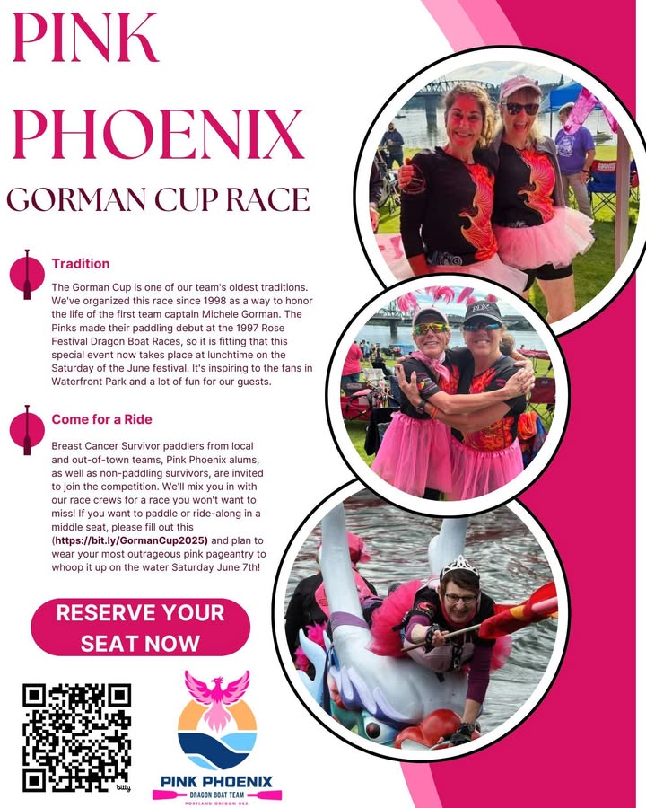 Calling all survivors. Join our friends at Pink Phoenix @pdxpinkphoenix for the annual Gorman Cup Race, a cherished tradition honoring team captain Michele Gorman. Happening Saturday, June 7th during the Rose Festival at Waterfront Park, this fun and meaningful dragon boat race is open to all breast cancer survivors, including non-paddlers.