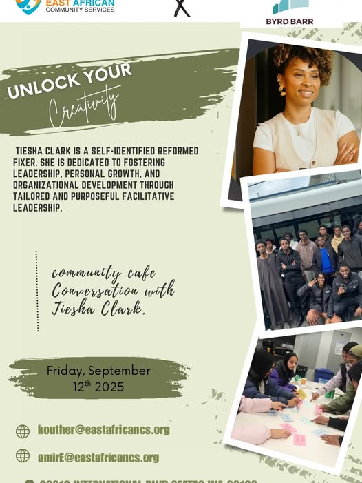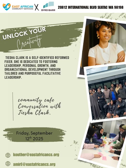 🌟 Join us this Friday for a Community Café Conversation with Teisha Clark. 🌟 Come through to The Level for good vibes, great conversations, and light snacks. Don’t miss this chance to connect and be inspired ✨ 📅 Friday, September 12th, 2025 📍 The Level #CommunityCafe #EastAfricanCommunity #SeattleEvents.