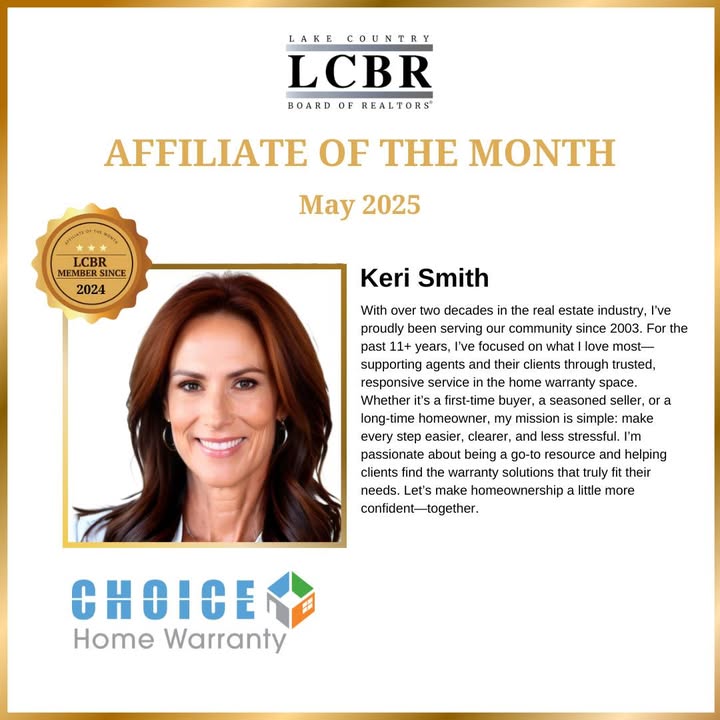 🎉 Help us congratulate Keri Smith of Choice Home Warranty — our May 2025 Affiliate of the Month. 👏 With over 20 years in the industry and a passion for supporting REALTORS® and their clients, Keri continues to go above and beyond to provide exceptional service and reliable home warranty solutions. 🏡💼 Thank you, Keri, for being such a valuable part of the LCBR community.
