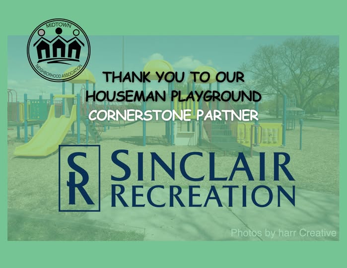 We can't believe our Houseman Playground Build begins NEXT week, we are thrilled. Midtown Neighborhood Association could not have re-created this playful space without the support of our community and local sponsors. SPECIAL THANK YOU TO Sinclair Recreation for their investment in Midtown Neighborhood, and Houseman Playground.