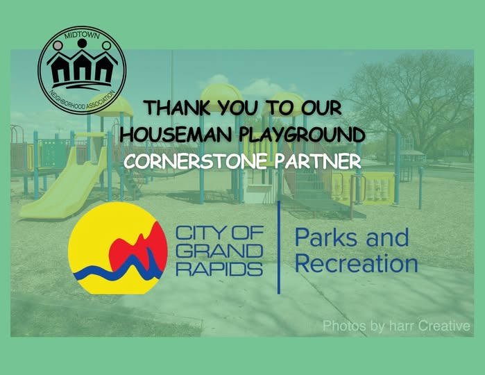 We can't believe our Houseman Playground Build begins Wednesday, we are thrilled. Midtown Neighborhood Association could not have re-created this playful space without the support of our community. SPECIAL THANK YOU TO City of Grand Rapids Parks and Recreation team for their investment in Midtown Neighborhood, and Houseman Playground.