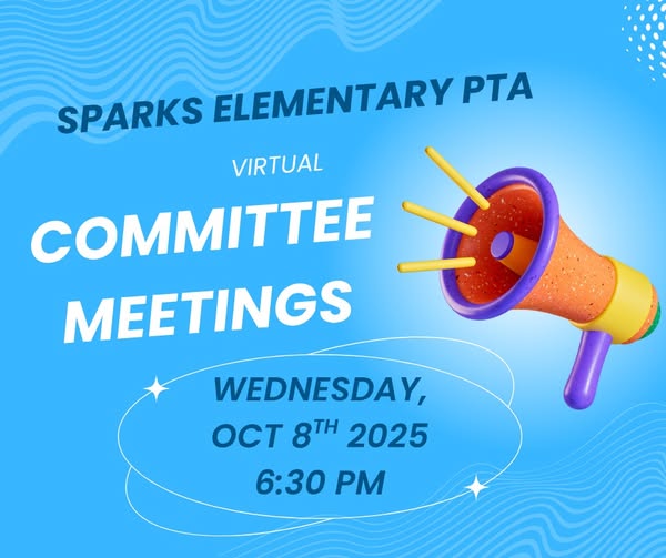 📣 You're Invited: PTA Committee Work Session – Tomorrow, October 8th at 6:30 PM (Virtual) We’re excited to invite all Sparks families to our very first PTA Committee Work Session on Wednesday, October 8th at 6:30 PM. This virtual event is a new format, different from a regular PTA meeting — it’s a chance for our committees to meet, collaborate, and plan upcoming events. This is a great opportunity to connect with other families, learn about volunteer opportunities, and find the best way for your family to get involved.
