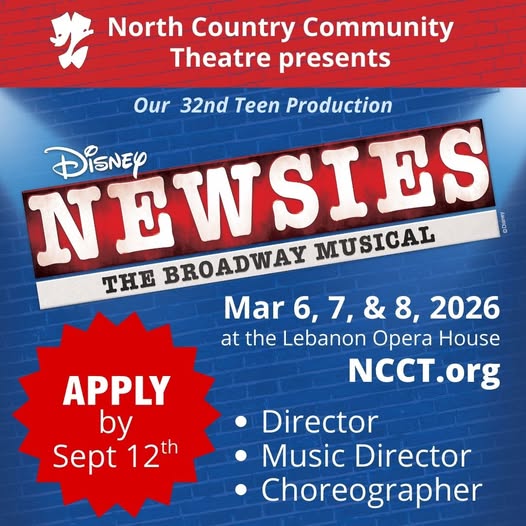 North Country Community Theatre | Upper Valley Theater Home Shows NCCT Teens Who We Are Get Involved Donate Contact More Teen Show 2026 Summer 2025 Support Us Putting the Upper Valley onstage since 1973 For over 50 years NCCT has been producing highquality community theater showcasing the talents of your Upper Valley friends and family. We intend to keep doing so long into the future. Creating opportunities for high school students onstage and off since 1994 For over 30 years NCCT has been channeling the tremendous energy commitment and talent of local youth to entertain the Upper Valley and beyond. We provide a unique space in which teens from across the Upper Valley and beyond can join together in a cooperative and noncompetitive atmosphere.