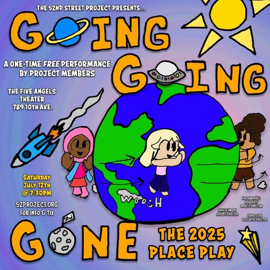Coming Your Way 🌏 GOING GOING GONE - Kicking off our 2025/2026 Season will be one of our newest programs. Place Play takes the Project members, and their adult volunteer partners, through the process of devising a full-length show, where all of the storylines intersect in one particular place. Free, Saturday, July 12, 7:30 pm, Five Angels Theater, 789 Tenth Ave, NYC, reservations available at www.