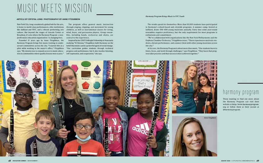 A nonprofit organization delivering high-quality music education to youth throughout New York City The mission of the Harmony Program is to support the healthy social-emotional development and academic achievement of children in underserved communities across New York City through the study and performance of music. By providing high-quality, year-round music instruction and ensemble training to children in underserved communities, the Harmony Program helps students develop musical proficiency as well as acquire the kind of “life skills” and habits of mind that lead to long-term success. The Harmony Program also addresses a shortage of well-trained music teachers by recruiting and training accomplished musicians as its teachers and instilling in them a long-term commitment to community outreach and education.