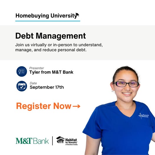 Join us for our upcoming workshop to learn more about how credit can be a powerful tool to build the future you want. Our partners at M&T Bank will break down how credit scores work, why they matter, and how you can strengthen yours on the path to homeownership. 📅 September 17 | 5:30 PM 📍 Habitat Dutchess Office ✨ Register now: https://buff.