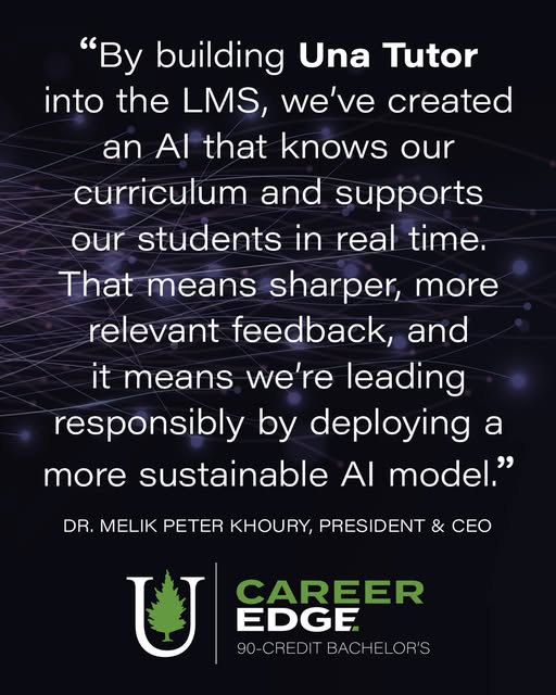 At Unity, AI is an integral part of your learning experience in our new 90-credit Applied Bachelor’s degree programs. Una Tutor is embedded directly in the Learning Management System (LMS) to provide real-time guidance, constructive feedback, and 24/7 support. Designed specifically to support learning, Una Tutor delivers up to ten times greater energy efficiency than commercially available models, allowing us to offer more personalized instruction while minimizing environmental impact.