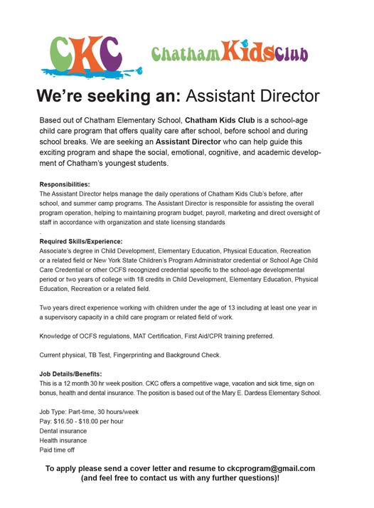 Chatham Kids Club is hiring an Assistant/Acting Director. The ideal candidate would be passionate about providing quality child care services and have experience working in a school age program. If you or someone you may know is interested please reach out to us at ckcprogram@gmail.
