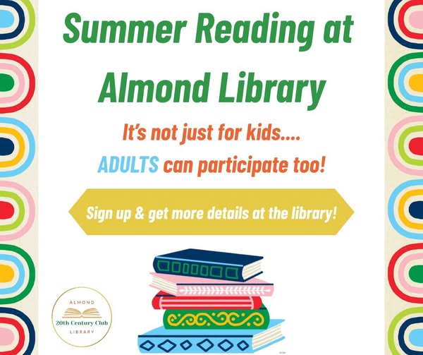Almond 20th Century Club Library Almond 20th Century Club Library Menu Almond Library Board Meeting will be held on Thursday February 27th at 630 PM. February Programming. Story Time Every Saturday at 1130 AM Valentines Card Making Saturday February 8th at 1 PM Space is limited RSVP required CoverToCover Book Club Wednesday February 12th at 6PM featuring The Firekeepers Daughter by Angeline Boulley For more information about programming just ask Bec at the library. Check out our Facebook page for our latest events.