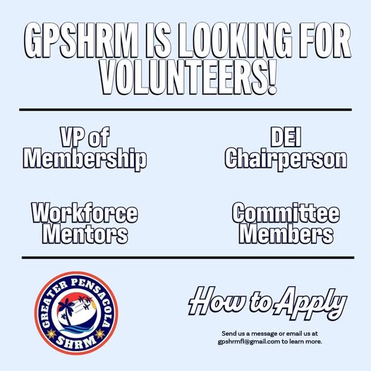 Greater Pensacola SHRM - Home Greater Pensacola society for human resource management MEMBER WEBSITE Not a Member Yet. Join Now. Support GPSHRM Sponsor a Meeting Interested in Volunteering. Join a Committee.