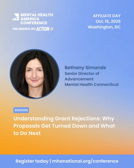 We’re thrilled to announce that MHC’s Senior Director of Advancement, Bethany Simmonds, will be presenting at the Mental Health America Conference on Affiliate Day. 🎤 Her session, “Understanding Grant Rejections: Why Proposals Get Turned Down and What to Do Next,” will help fundraisers turn every “no” into a learning opportunity. Attendees will gain strategies to assess the funding landscape, use AI tools to streamline grant writing, craft funder-aligned proposals, decode rejection notices, and transform setbacks into long-term success.