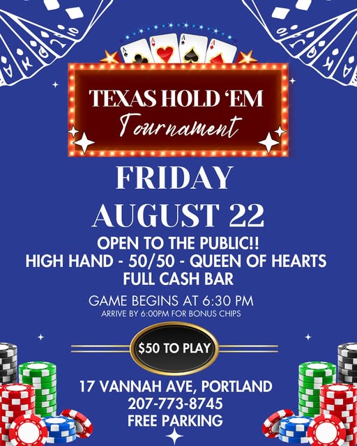 Texas Holdβem Poker Friday August 22nd. Open to the Public and only $50 to play. High Hand, Full cash bar, food, pull-tabs, 50/50, Queen of Hearts all available for purchase We have plenty of free parking on site at 17 Vannah Ave at the Woodfordβs Corner VFW #maine #poker #portlandmaine #texasholdem #oldportmaine #portlandme.