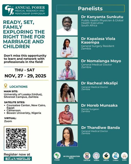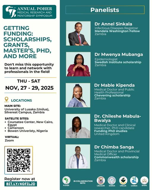 Pan-African Organization for Health, Education and Research (POHER) MEDICAL RESEARCH AND MENTORSHIP SYMPOSIUM GETTING FUNDED - scholarships, grants and more financial support: how. MEET OUR SPEAKERS & FUNDING FOCUS Dr Annel Sinkala 💫Mandela Washington fellowship Dr Mwenya Mubanga 💫Swedish Institute scholarships Dr Mable Kipenda 💫Chevening scholarship Dr. Chileshe Mabula-Bwalya 💫PhD funding and journey Dr Chimba Sanga 💫Commonwealth scholarship REGISTER HERE: https://www.