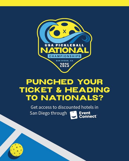 Win a golden ticket ✅ Register for Nationals ✅ …Now it’s time to book your hotel with EventConnect. With EventConnect, you can book exclusive hotel rates right in the heart of San Diego and just minutes from Barnes Tennis Center. Stay close to the action, soak up the city’s sunshine, and make every part of your Nationals trip unforgettable.