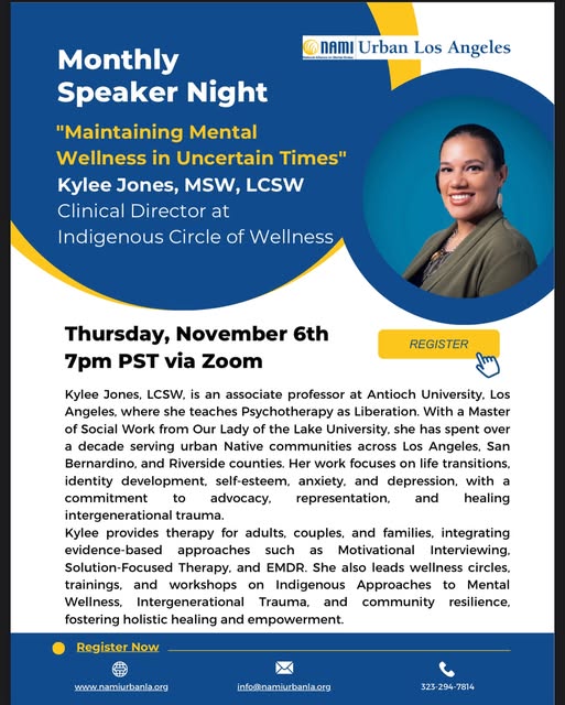 ๐ SPEAKER NIGHT IS BACK ๐ THURSDAY, NOVEMBER 6TH 7PM PST VIA ZOOM โMaintaining Mental Wellness in Uncertain Timesโ Join us the 1st Thursday of every month for our Monthly Speaker Night series. It is designed to be a safe and supportive space for community members to engage with mental health professionals and advocates. NOVEMBER 2025 SPEAKER: Kylee Jones, LCSW Clinical Director at Indigenous Circle of Wellness Register by visiting our website www.
