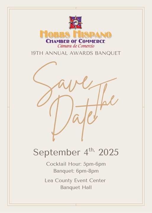 🎉 Save the Date. 🎉 Join us for the Hobbs Hispano Chamber of Commerce 19th Annual Awards Banquet on Thursday, September 4, 2025 at the Lea County Event Center Banquet Hall. 🍸 Cocktail Hour: 5:00 PM – 6:00 PM 🍽 Banquet & Awards: 6:00 PM – 8:00 PM Let’s celebrate excellence, community, and the leaders who make Hobbs shine.