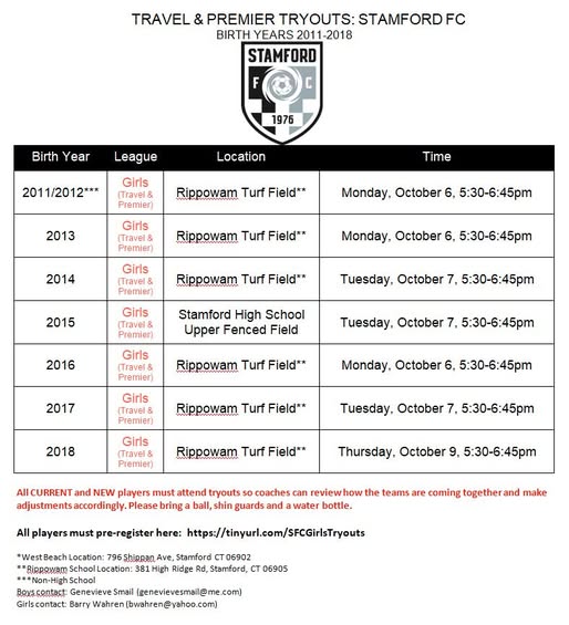 Stamford FC Girls Travel/Premier Tryout Schedule Announced All CURRENT and NEW players must attend tryouts so coaches can review how the teams are coming together and make adjustments accordingly. Please bring a ball, shin guards and a water bottle. All players must pre-register here: https://tinyurl.