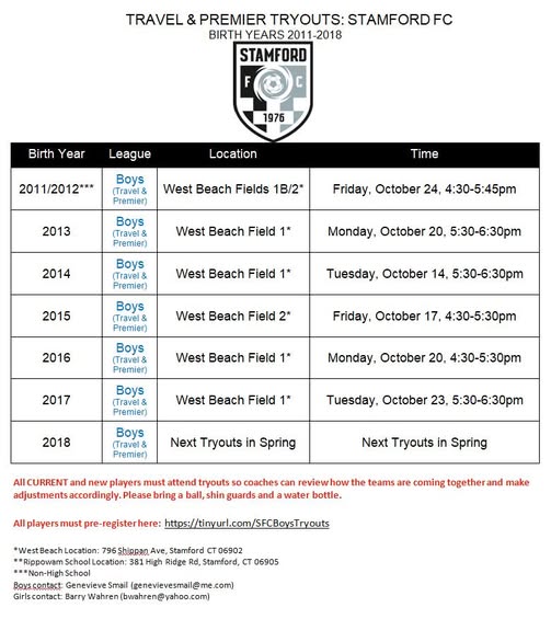 Stamford FC Boys Travel/Premier Tryouts Announced All CURRENT and new players must attend tryouts so coaches can review how the teams are coming together and make adjustments accordingly. Please bring a ball, shin guards and a water bottle. All players must pre-register here: https://tinyurl.