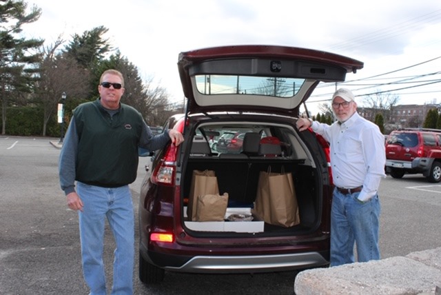 Friendly Sons of Saint Patrick on Long Island deliver 60 Dinners to Northwell Long Island Jewish Valley Stream on Sat 4/4/20. Meals where prepared by Mike Sweeneyfrom Sweeneys Uptown Grill in Garden City Picture Mike Sweeney and John P McDonough (Friendly Sons of Saint Patrick) load up the car for delivery.