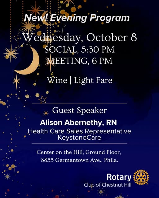 Join us for our new Evening Program. Our speaker will be, Alison Abernethy RN, Health Care Sales Representative will present about the vital services that KeystoneCare provides for its clients in the Philadelphia region. KeystoneCare is a nonprofit organization with a mission to deliver exceptional, comprehensive care, improving quality of life for patients and their families with in-home comfort and dignity, regardless of stage of life or state of health.