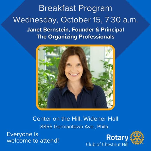 The Rotary Club Of Chestnut Hill’s guest speaker this week is Janet Bernstein, CPO®, Founder & Principal, The Organizing Professionals. She will speak about the services her company offers to clients ranging from home organization and floor plan and design to senior moving. In 2006, she founded Janet Bernstein Organizers and built a substantial word-of-mouth clientele in New York City before relocating in 2008 to the Philadelphia area.