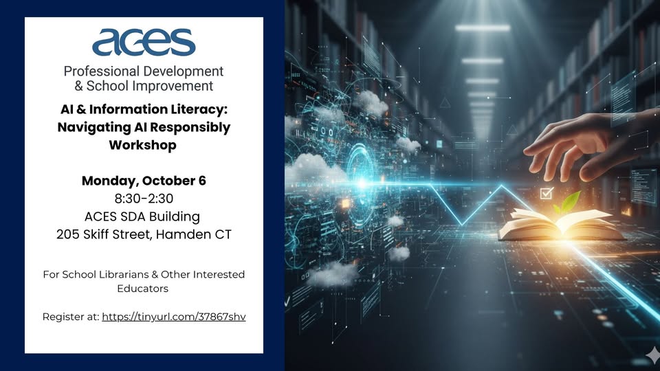 From ACES: Please join us on Monday, October 6 from 8:30-2:30 at the ACES SDA offices in Hamden, for βAI & Information Literacy: Navigating AI Responsibly. β During this in-person session, library media specialists will engage in collaborative exploration and hands-on activities to understand the evolving role of AI in research, digital literacy, and ethical information use. Through guided discussions, tool demonstrations, and shared problem-solving, participants will develop strategies to integrate AI into media instruction, curate responsible digital resources, and support students in navigating AI-generated content with discernment.