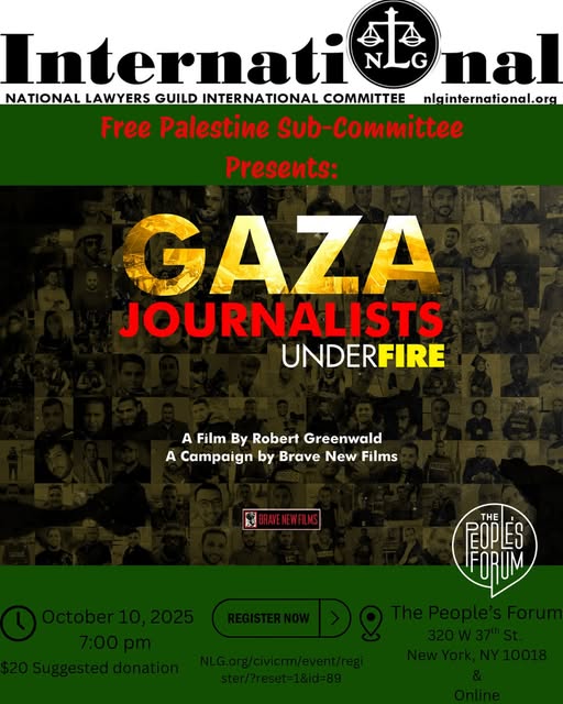 Join the Free Palestine Subcomittee of the NLG International Committee Friday, October 10, 7:00pm ET - 8:30 ET In-Person at The People’s Forum, 320 N 37th St. , New York, NY or online (Zoom link provided upon registration) Suggested Donation $20 The National Lawyers Guild’s International - Free Palestine Sub-Committee is thrilled to partner with Brave New Films to screen the film *GAZA JOURNALISTS UNDER FIRE*. This film exposes Israel’s crimes against journalists through the work of Belal Jadallah, Heba A-Abadla, and Ismail Al-Ghoul, all martyred during the ongoing genocide against Palestinians in Gaza.